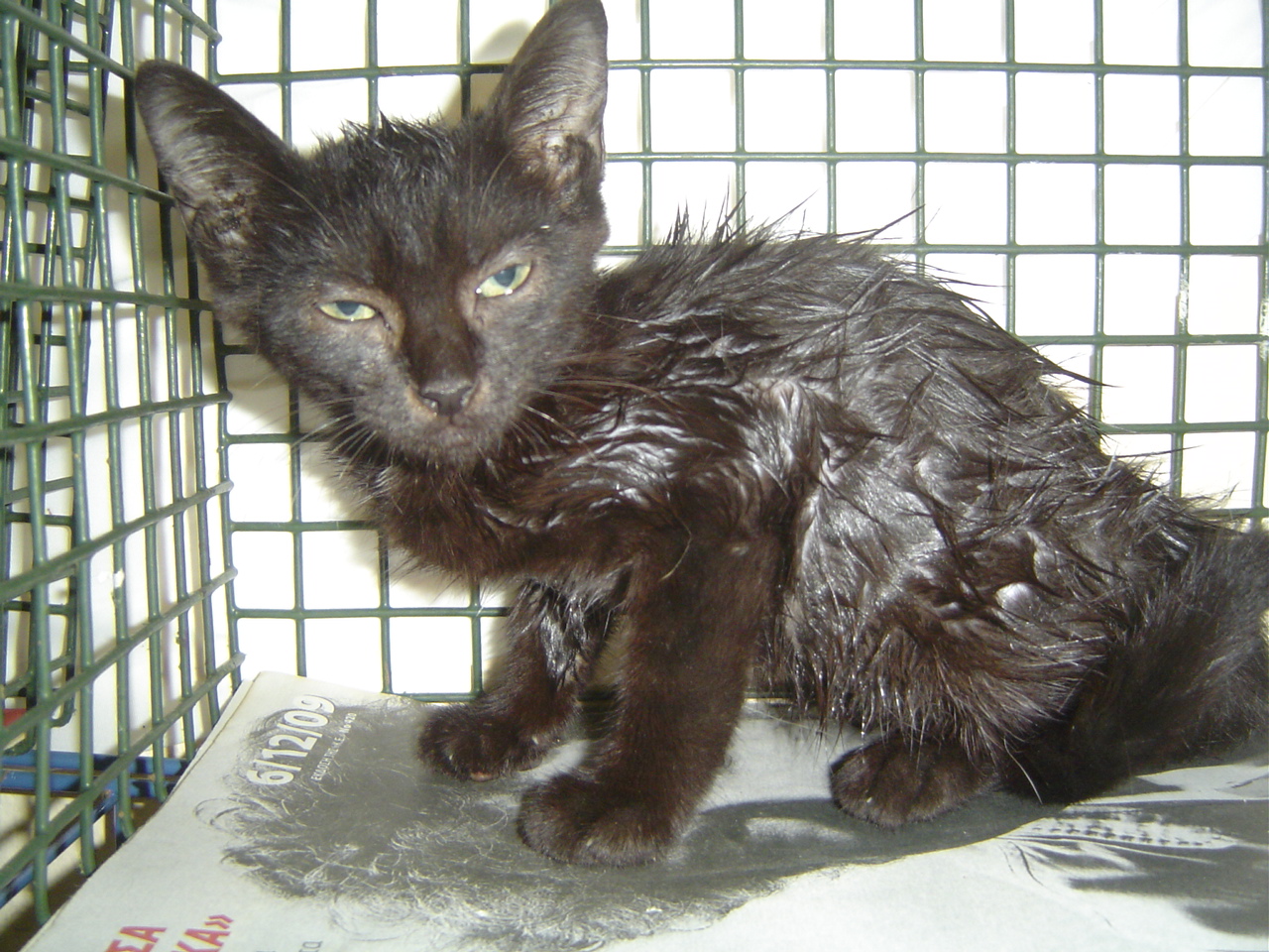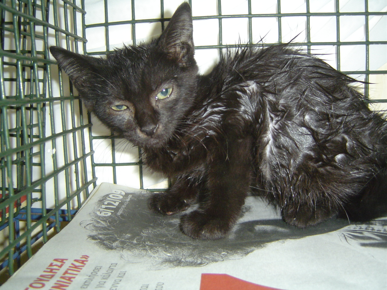 Οση ωρα προσπαθουσαμε να πιασουμε την μικρουλα, ακουγαμε ενα μικρο να κλαιει με φωνη σχεδον ξεψυχισμενη μεσα απο μηχανη αυτοκινητου. Αφου τακτοποιησαμε την μικρουλα στην θερμοφορα, γυρισαμε και αρχισαμε να προσπαθουμε να εντοπισουμε τον μικρουλη. Καποιος απο τους ιδιοκτητες των μαγαζιων γυρισε και μας ειπε ΄" πεντε μερες ειναι που τσιριζει και πηγαινοερχεται απο μηχανη σε μηχανη αυτοκινητου". Δεν χρειαστηκαν ουτε πεντε λεπτα για να πιασουμε τον μικρο μαυρουλη. Στην μυρωδια της κονσερβας και μονο το ταλαιπωρο εκανε κυριολεκτικα αγωνα δρομου και τρυπωσε στο κλουβακι.