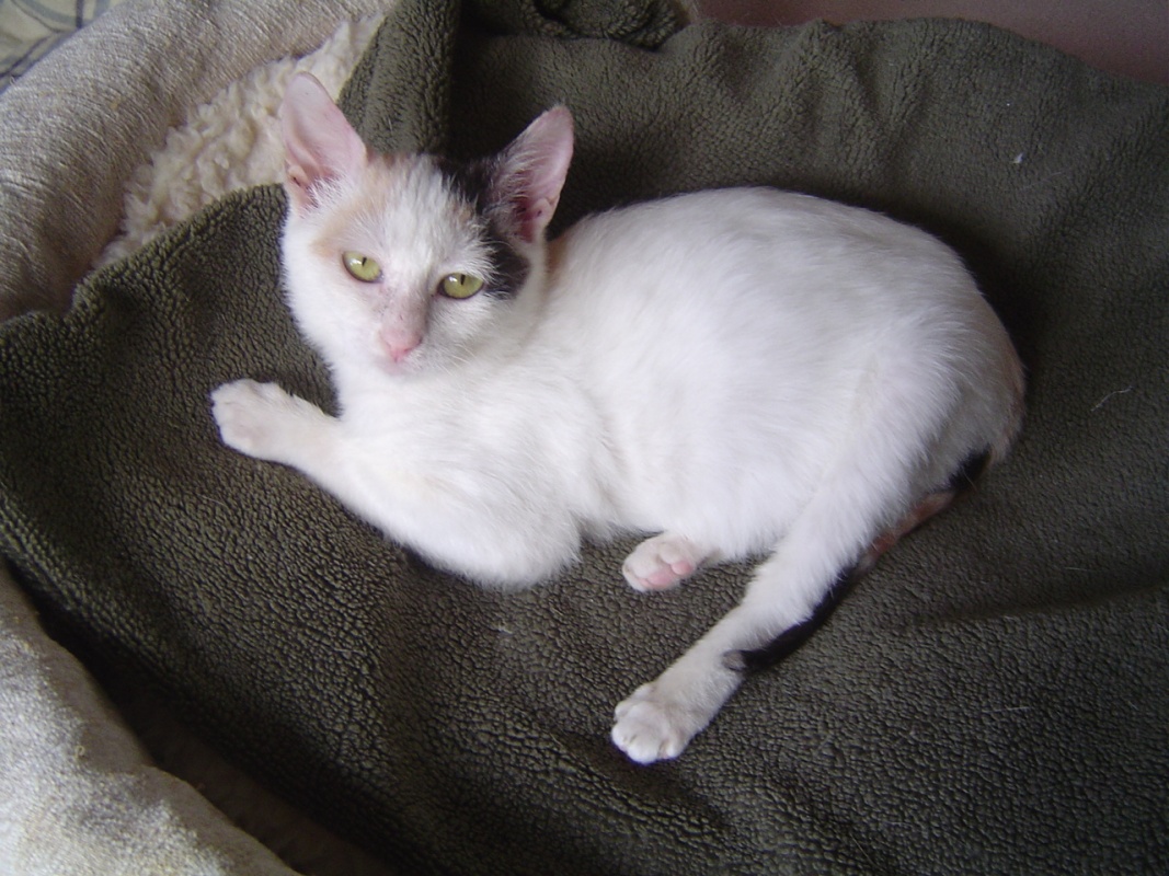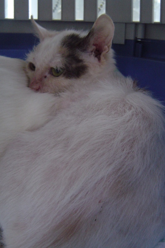 Την βρηκα με τον αδελφουλη της πριν απο 5 μηνες σε ακατοικητο στην οδο Παπαφη. Στο σωμα τους δεν υπηρχε τριχωμα παρα μονο σε απειροελαχιστα σημεια καποιες τριχουλες, παρα το γεγονος οτι τα μικρουλια ηταν περιπου 2 μηνων. Στην αρχη πιστεψα οτι ηταν κατι δερματικο. Στην πορεια ανακαλυψαμε οτι το προβλημα ηταν καποιο πολυ σπανιο ορμονικο. Ο αδελφουλης της μετα απο δυο μηνες συνηλθε ομως η ιδια δεν μπορουσε να αφομοιωσει τα θρεπτικα συστατικα της τροφης και τα απεβαλε. Ετσι η προτεινομενη λυση ηταν η ευθανασια.Προγραμματιστηκε και αφου την ανεβαλα για τρεις μηνες η μικρουλα αρχσε να βγαζει το πρωτο χνουδακι στο σωματακι της και τωρα την καμαρωνω φουντωτη και ευτυχισμενη αλλα με πολυ μεγαλη καθυστερηση στην αναπτυξη της σε σχεση με τον αδελφουλη της. Μολις επιβεβαιωθει με εργαστηριακες εξετασεις, η αποθεραπεια της μικρουλας θα την προωθησω για υιοθεσια.