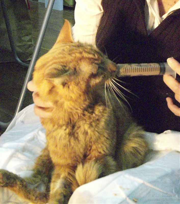 Παιδια.. με το που τον αγγιξα δειλα-δειλα στην αρχη ξεδιπλωθηκε αυτος ο υπεροχος γαταρος, "ζυμωσε" με τα χερακια του τριγυρω και αρχισε να γουργουριζει σε σημειο που ακουγοταν ως το διπλανο δωματιο!! Το γατακι εχει απιστευτη θεληση να ζησει και τρομερη αναγκη απο περιποιηση, χαδακια και γλυκα λογια.... Λειψαμε για λιγο γιατι πηγαμε να δουμε τα 'εσπεριδοειδη' και οταν ξαναγυρισαμε ο Αλλαντινακος ηταν καθιστος σχεδον και περιμενε νεα δοση χαδιων!!!