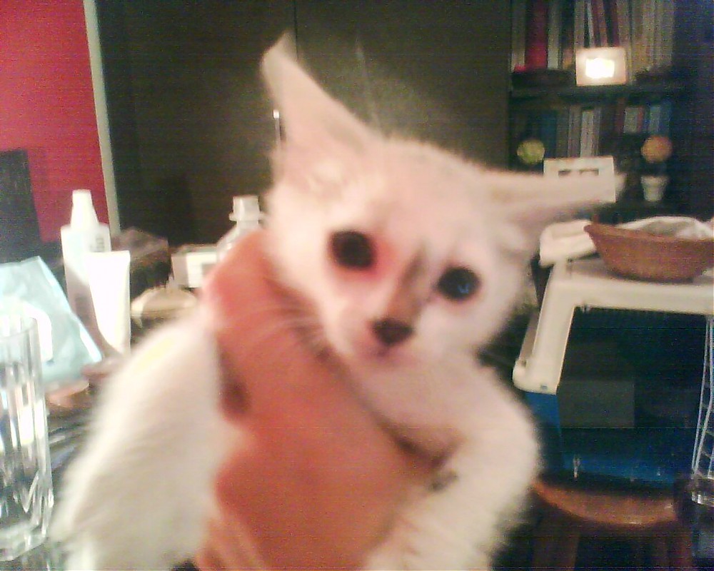 Ειναι λευκούλης με μια λοξη μουτσουρίτσα στην μυτούλα, ριγωτή ουρίτσα και ριγωτά πισω ποδαράκια.
