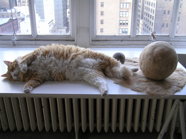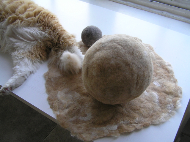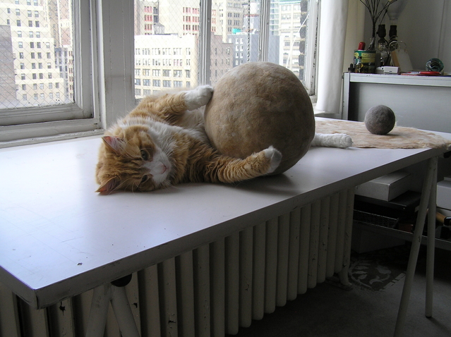 η μπαλα αυτη ειναι φτιαγμενη απο τις τριχες της γατας που βλεπετε στην φωτο!!! αυτη που την εχει τις μαζευε και τις εκανε μπαλα, και τωρα η γατα της παιζει με αυτη!!!! απιστευτο???