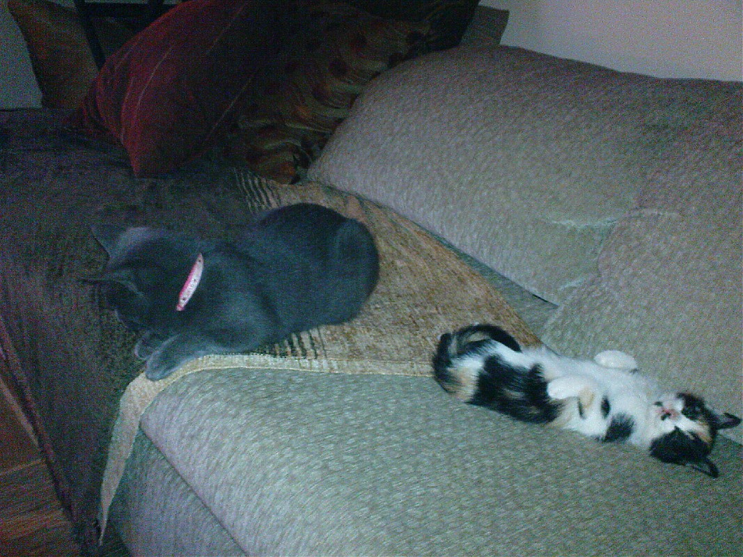 Πάντως έχουν αρχίσει να γίνονται φιλαράκια, παίζουν με τις ώρες, η Μουτζούρα τρώει πολύ ξύλο αλλά δείχνει να το ευχαριστιέται που έχει επιτέλους γατο-παρέα!!! Το Κατέλι από την άλλη βρήκε "θύμα" να κάνει μαγκιές, γιατί γενικά μέχρι τώρα ήταν αυτή το "θύμα" ανάμεσα στις υπόλοιπες γάτες του κήπου, που είναι αδέσποτες και άρα πιο ξεψαρωμένες από τη δική μας την αγαθιάρα!