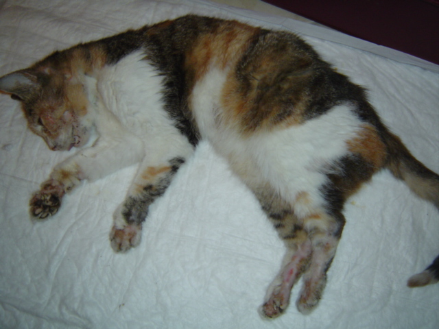 Φιλοξενω ακομη μια γατουλα στο σπιτι με το ιδιο και πολυ πολυ χειροτερο προβλημα αλεργιας το οποιο δεν ειναι εντοπισμενο μονο σε ενα σημειο αλλα σε ολοκληρο το σωμα της. Λογω του οτι ειναι Θετικη σε FIV και καθως καταλαβαινεις το ανοσοποιητικο συστημα πεσμενο η κατασταση ειναι τραγικη. Περιμενω τα τελευταια αποτελεσματα απο τις βιοψιες που εστειλαν οι κτηνιατροι στην Αγγλια, για να δοκιμασουμε μια καινουρια μεθοδο θεραπειας στο συγκεκριμενο ζωο.