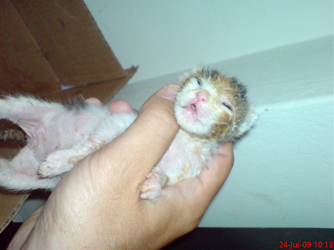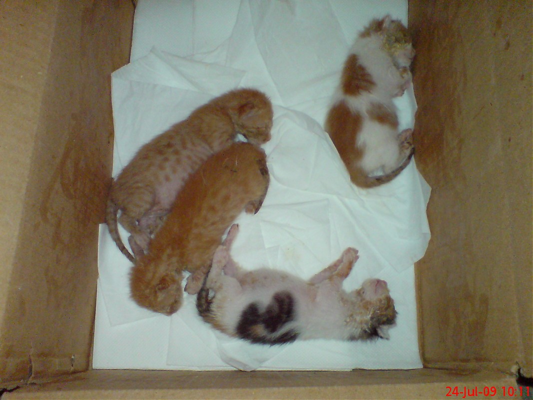 (τρωγανε με το ζορι και ητανε πολυ ασθενικα, το ενα μαλιστα ητανε ολομαυρο, για μενα το ποιο ομορφο), τα αλλα 3 συμπεριφερονται κανονικα(Οταν τα βρηκα ειχανε ακομα τους ομφαλιους λωρους(ξεραμενους) καποια απο αυτα, απο χτες εχουν αρχιζει και ανοιγουν τα ματακια τους, οποτε οταν τα βρηκα πρεπει να ητανε 2-3 ημερων.)