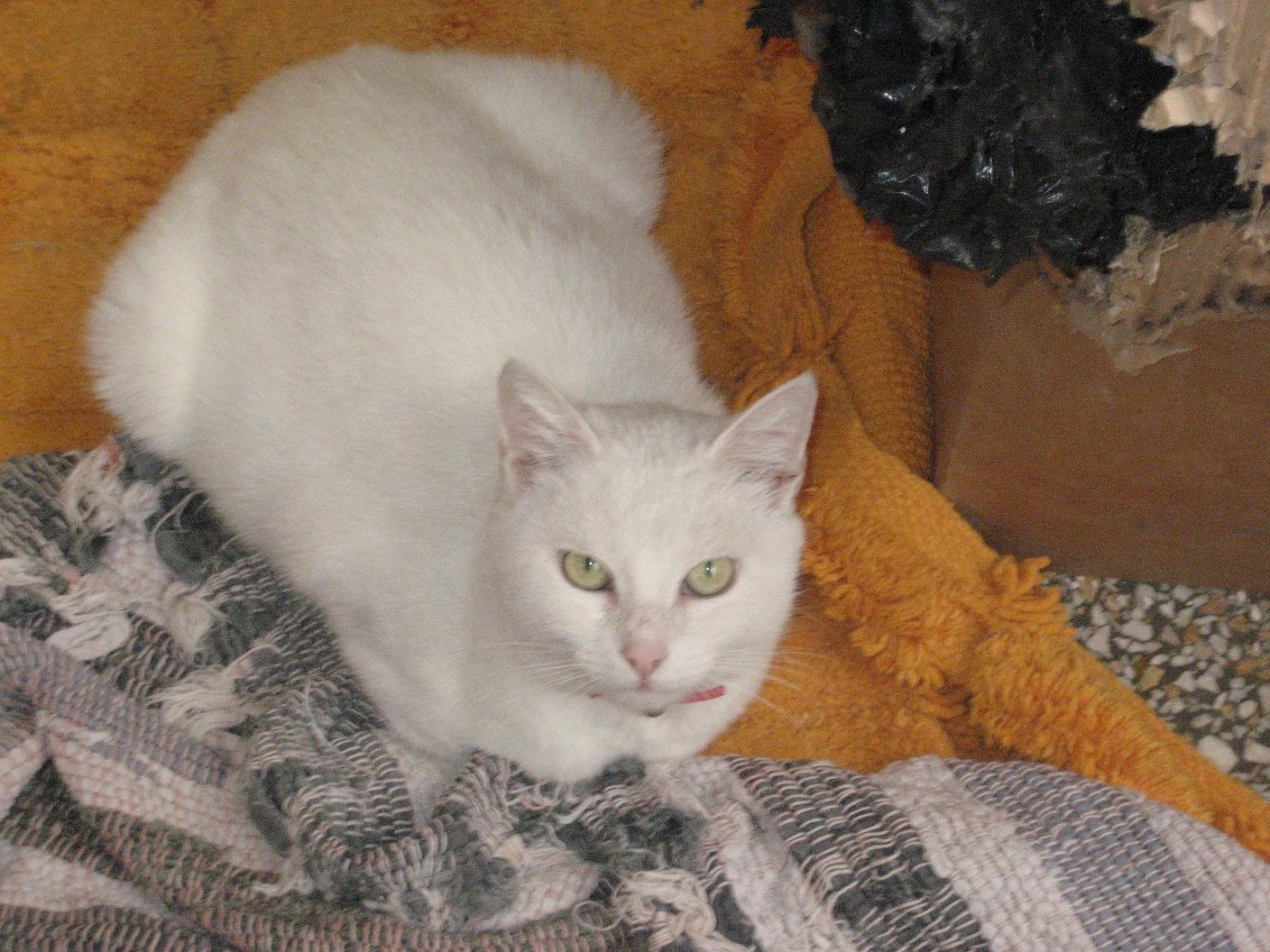 Αν δεν βρήκατε ακόμη γατάκι ρίξε μια ματιά και στην Χουρχουρίτσα. Είναι ημίαιμη ολόλευκη γατούλα 1,5 ετών, στειρωμένη με βιβλιάριο υγείας, αποπαρασιτωμένη εσωτερικά και εξωτερικά από κτηνίατρο και μαθημένη να πηγαίνει σε αμμούλα. Είναι ενήλικη γατούλα, αλλά είναι πραγματικά μια χουρχουρομηχανή, την χαιδεύεις και γυρίζει ανάποδα την κοιλίτσα της για να την χαιδέψεις και εκεί. Άμα θέλετε μπορείτε να έρθετε να την δείτε και από κοντά.