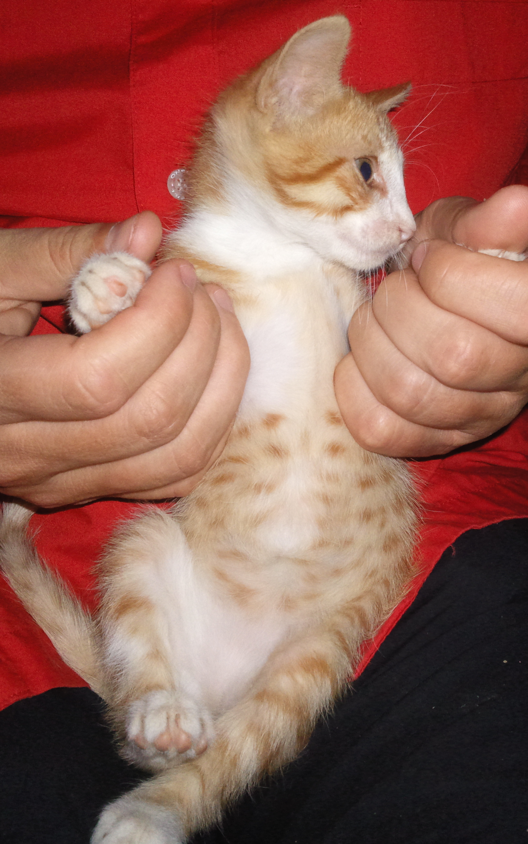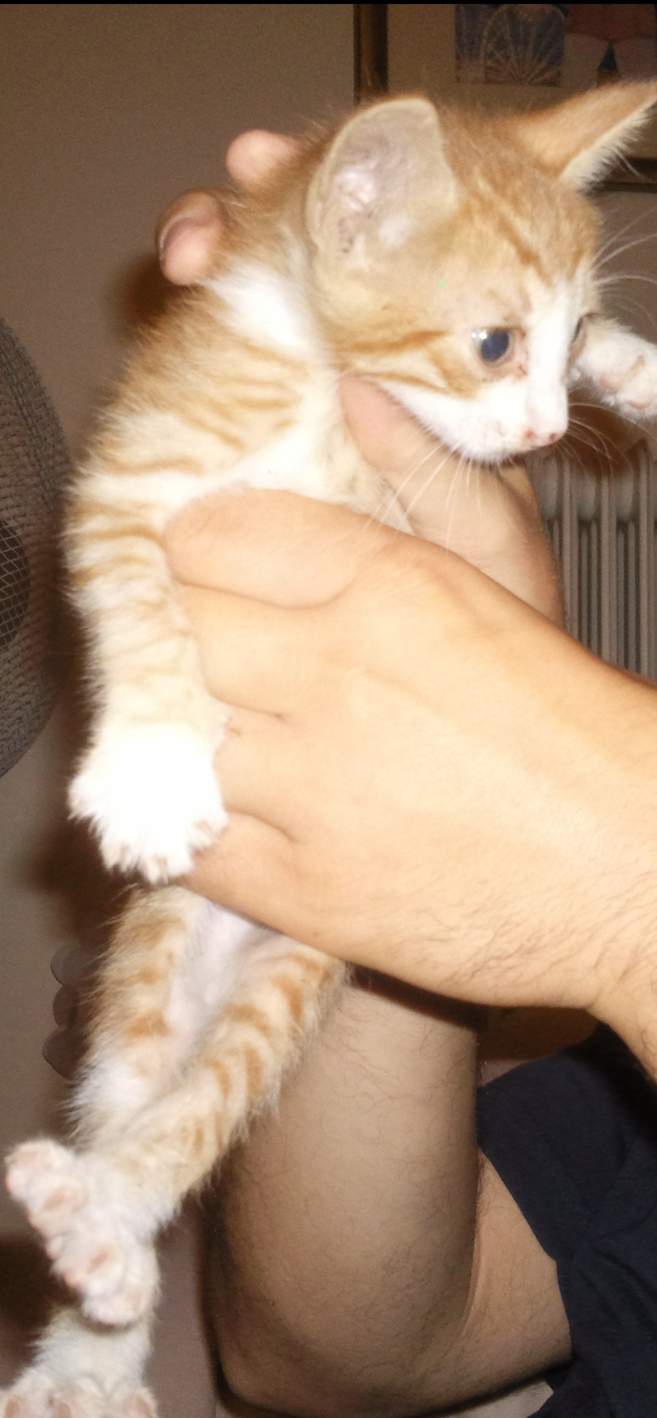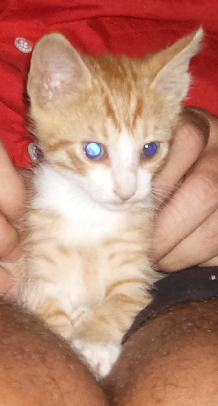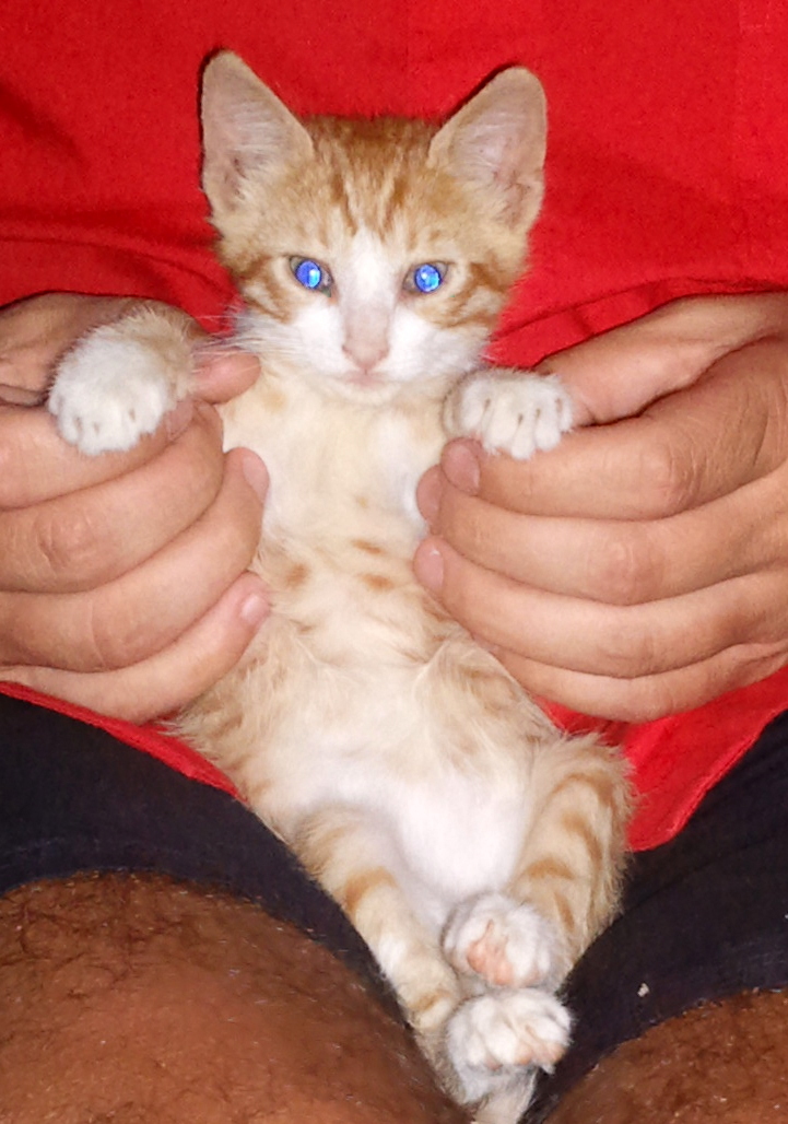 Είναι 50 ημερών,αρσενικό ,πορτοκαλί-λευκό,με μπλε ματάκια,τρώει κροκετάκια (royal canin για γατάκια).