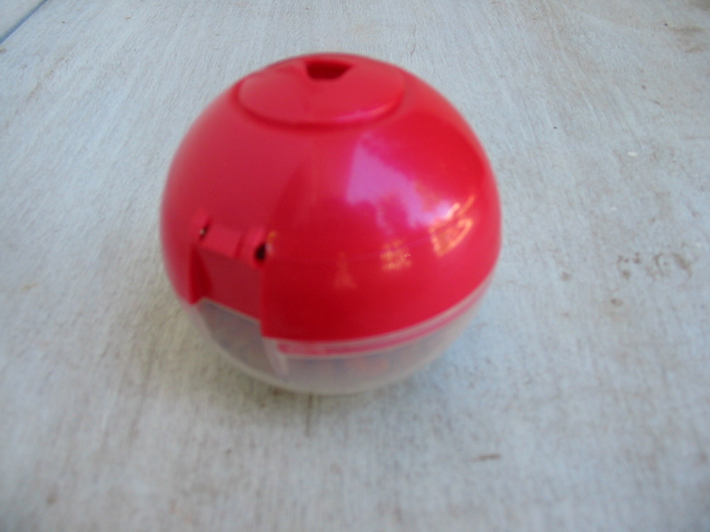 Υπαρχουν στο σουπερ μαρκετ κατι κουτακια με τσιχλες που μοιαζουν με μπαλιτσες και εχουν καπακι. Το αδειασα και ανοιξα μια τρυπουλα ίσα ίσα για να χωραει να βγαινει μια κροκετα. Το γεμισα ξηρη τροφη και το δοκιμασα στα μικρα. Παιζουν σαν τρελα. Το πανε βολτα και που και που βγαινει και λιγο φαγακι και ενθουσιαζονται.