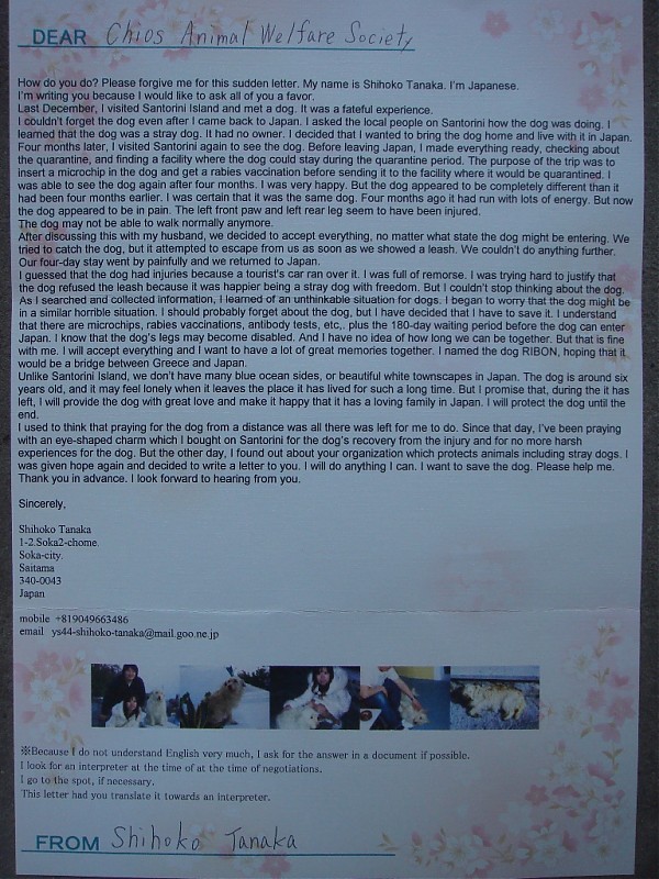 Όταν λες "Γιαπωνέζοι ψάχνουν ζώα στη Χίο", τι εννοείς ακριβώς; Το γράμμα εστάλη στη φιλοζωική Χίου από μία γιαπωνέζα τουρίστρια που επισκέφτηκε τη Σαντορίνη, είδε ένα αδέσποτο σκυλάκι και θέλησε να το πάρει μαζί της στην Ιαπωνία και ζητάει τη βοήθεια της φιλοζωικής, καθώς το ζωάκι είναι προφανώς χτυπημένο και φοβισμένο.