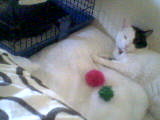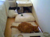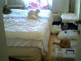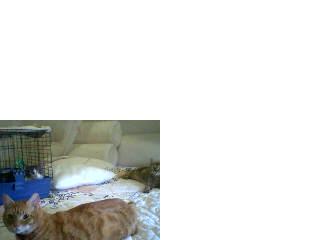 Σήμερα δοκίμασα να βγαλω την πετσετα απο το διαφανο κλουβι αλλα ερχονταν ο βουλιτσος κα επαιζαν ξυλο μεσα απο τα καγγελα και την ειδα μετα να τρεμει και να εχει μεγαλες κονχες... ασχετα που τον βλεπει οτι ειναι τρυφερος αυτη επιμενει να τον φοβαται οποτε ξαναεβαλα την πετσετα και τα προστατευτικα μεξιλαρια και μετακομισα το κλουβι στο κρεββατι που κοιμουνται συνηθως τα αλλα... τα αφησα μονα και διαμορφώθηκε η εξης εικονα: ειχαν παει ολα πιο εκει μέν, αλλα ανεβηκαν και κοιμοντουσαν.. με τα πολλα χαλαρωσε κι εκεινη. Οταν μπαινω μεσα ομως τοτε ειναι που ξεκινανε οι αντιδικιες και τα μαλωματα...
