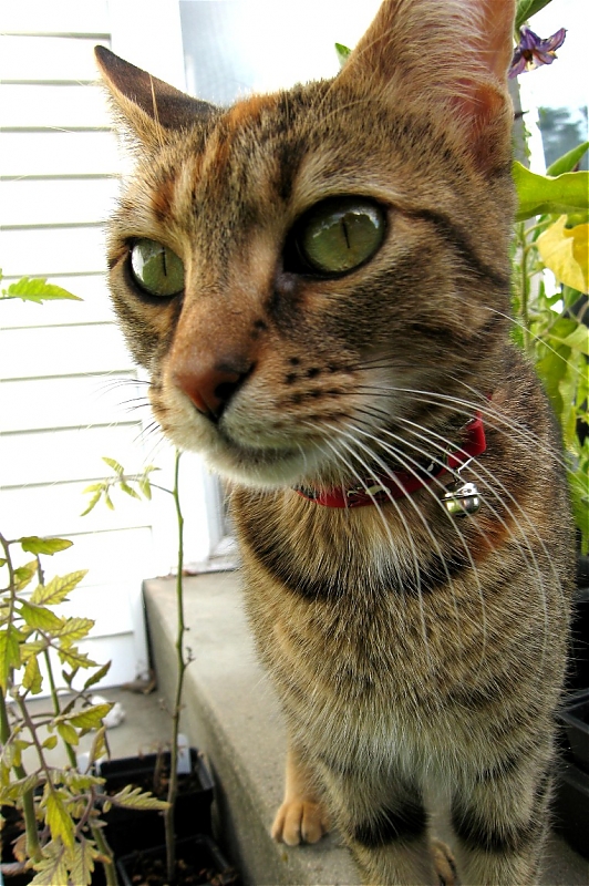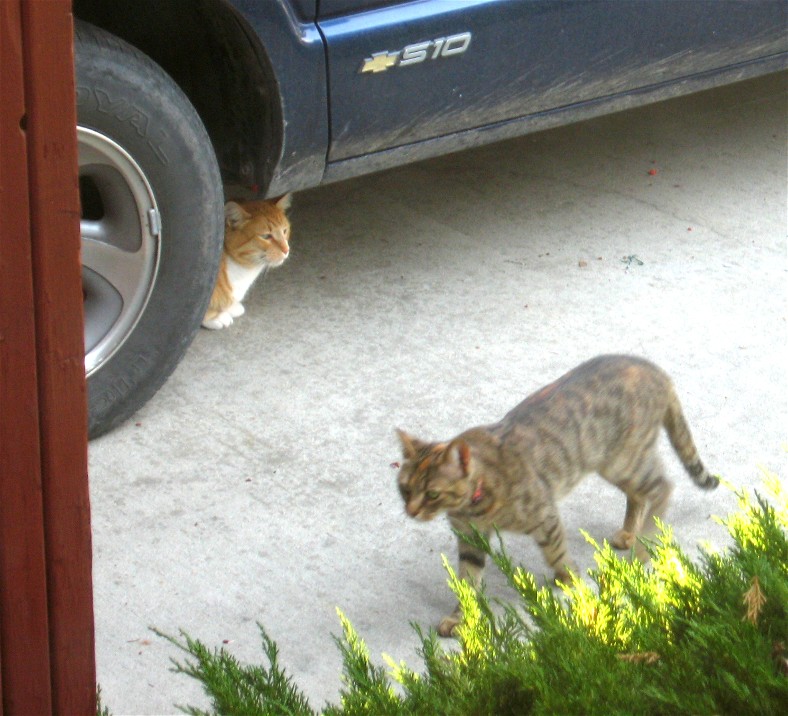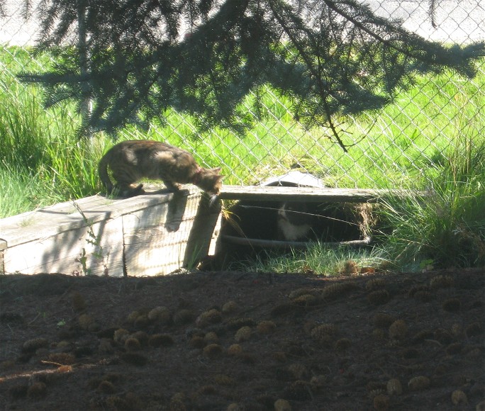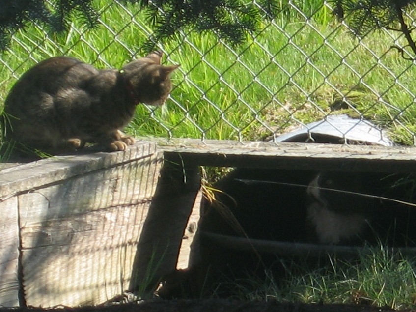 Χθες το βράδυ ο Μαρκ τη φώναζε να μπει στο σπίτι να κοιμηθεί και η κυρία δεν ήθελε. Προτίμησε να κοιμηθεί στο σπιτάκι της στον κήπο -πράγμα που δείχνει πως δεν νιώθει απειλή από τους γάτους.Μάλλον το διασκεδάζει. Αλλιώς θα νιαούριζε να μπει μέσα.