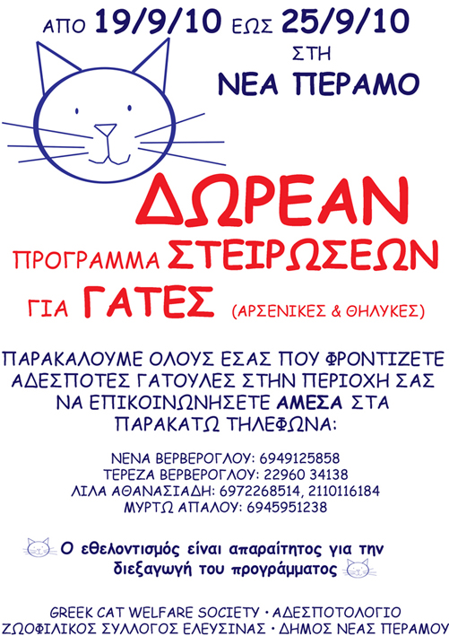 Από 19/9/2010 εώς τις 24/9/2010 θα τρέξει ένα πρόγραμμα στειρώσεων για αδέσποτα γατούνια στην περιοχή του Μεγάλου Πεύκου/Νέας Περάμου, στα αποδυτήρια του Δημοτικού Γηπέδου.