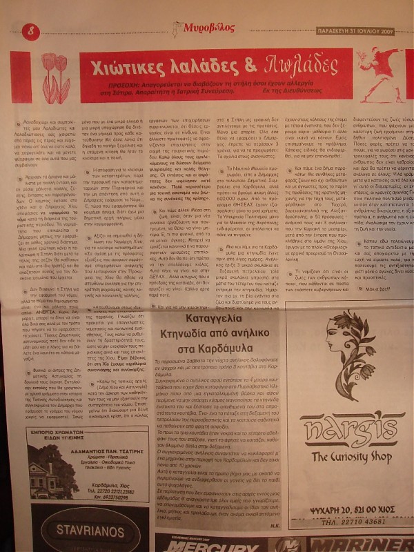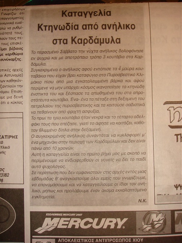 "Πριν δεκαπέντε μέρες περίπου έστειλα ένα μήνυμα και αντίγραφα της εφημερίδας σχετικά με τις δηλητηριάσεις στο λιμάνι της Χίου. Δηλητηριάστηκαν από "αγνώστους" σκυλιά που είχαμε εμβολιάσει και στειρώσει τις προηγούμενες μέρες. Έγραψα επίσης τις διευθύνσεις των εφημερίδων εάν κανείς ήθελε να διαμαρτυρηθεί γιατί το μόνο πράγμα που φοβάται η τοπική αυτοδιοίκηση είναι ο διασυρμός εκτός της επικράτειας τους (εδώ τους ξέρουν από την καλή κι από την ανάποδη). Μόνο έτσι πιέζονται για να κάνουν κάτι. Οι εφημερίδες δεν έγραψαν τίποτα γιατί φαντάζομαι πως κανείς δεν έστειλε κάτι.