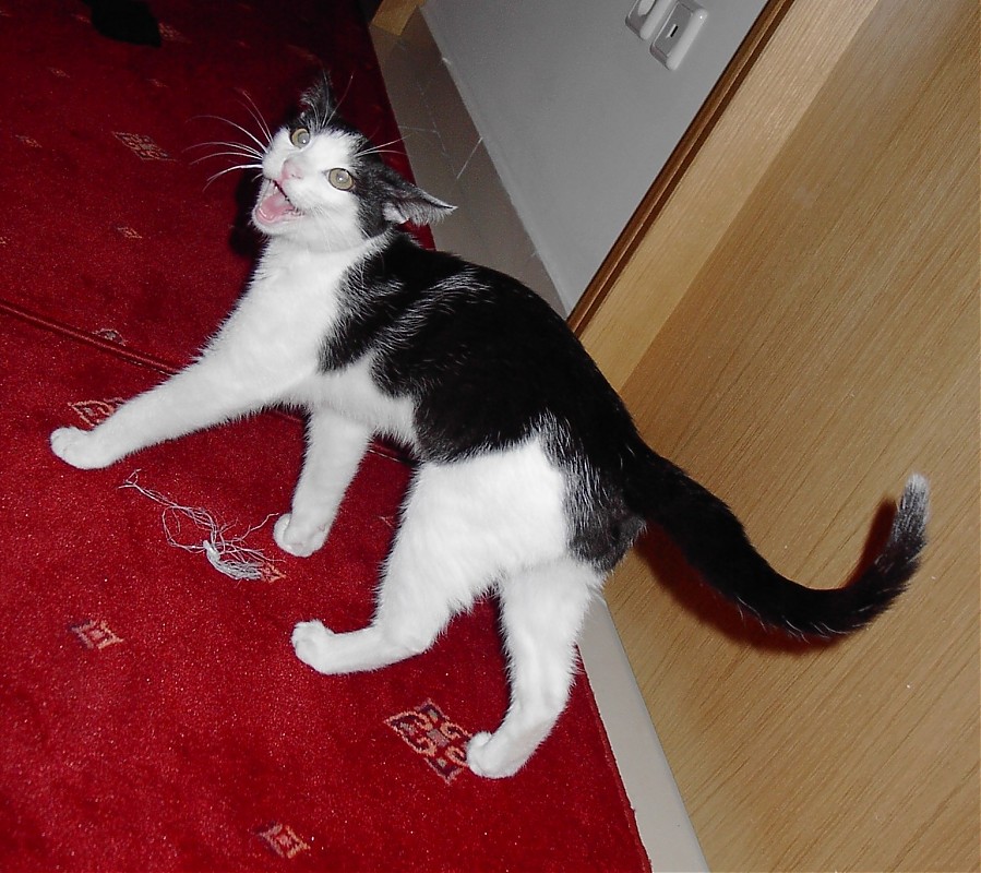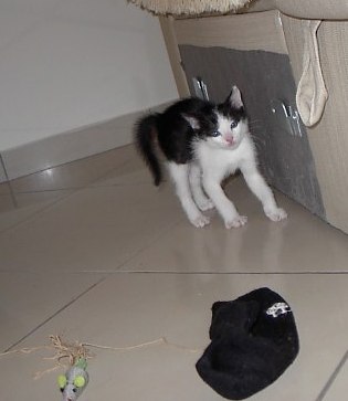 Αυτό πάντως με τη φουντωμένη ουρά σε καμπύλη και το "βρυχηθμό" είναι κλασικό παιχνίδι-λύσσα μικρού γατιού, όλα μου τα γατιά το έκαναν όταν ήταν μικρά και έπαιζαν (σε συνδυασμό με καμπούρα και πλαϊνά πηδηματάκια κιόλας -πολλή πλάκα) :D