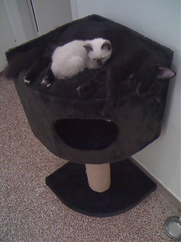 Χτες έδειχνα την πρωτη φωτο στη Ράνια,και της ελεγα οτι ειναι κι ο Μέλας με τη μικρη και δεν τον έβλεπε!Εγώ βλέπω μαζί με τη σιαμεζούλα και κάτι μαύρα αυτιά, άσπρες τουφίτσες ανάμεσα και μαυρόασπρες πατουσίτσεςΜε πέθανες, έλιωσα, η φωτογραφία ειναι υπέροχη