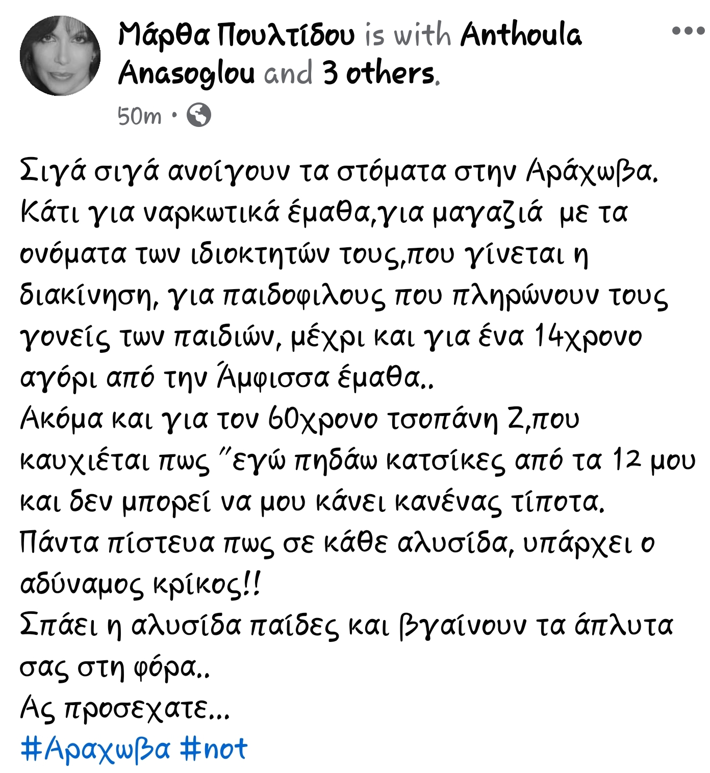 ΝΑ ΣΤΑΜΑΤΗΣΟΥΝ ΟΙ ΑΚΥΡΩΣΕΙΣ ΣΤΗΝ ΑΡΑΧΩΒΑ.Αντο λοιππον ηα στυνομια να πει ΔΕΝ ΕΧΟΥΜΕ ΣΤΟΙΧΕΙΑ ΠΟΙΟΣ ΕΙΝΑΙ Ο ΕΝΟΧΟΣ..ΠΡΟΤΙΜΟΥΝ ΤΟ ΔΕΝ ΤΟ ΕΚΑΝΕ ΑΝΘΡΩΠΟΣ.