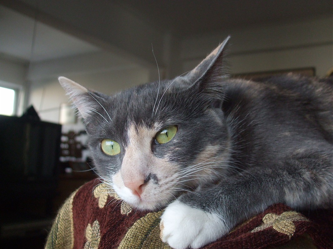 Θα ψάξω οπωσδήποτε για λέιζερ, θα τρελλαθεί το Μπασσουλίνι μου!!!! Και, για όσους μας πεθύμησαν......Να την στην πιο αγαπημένη της θέση: Επάνω στην πλάτη της πολυθρόνας, όπου, αφού χάζεψε με τις ώρες έξω από το τζάμι, σκέφτεται σοβαρά, τί να κάνει; Να πάει να κοιμηθεί στη μέσα φωλιά ή στην παραμέσα;Τί φοβερό δίλημμα Σημείωση: Το μήνυμα αυτό γράφτηκε 17 χρόνια πριν. Ο συντάκτης του πιθανόν να έχει αλλάξει απόψεις έκτοτε.