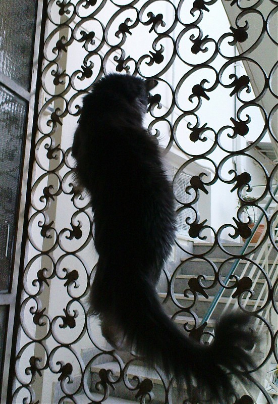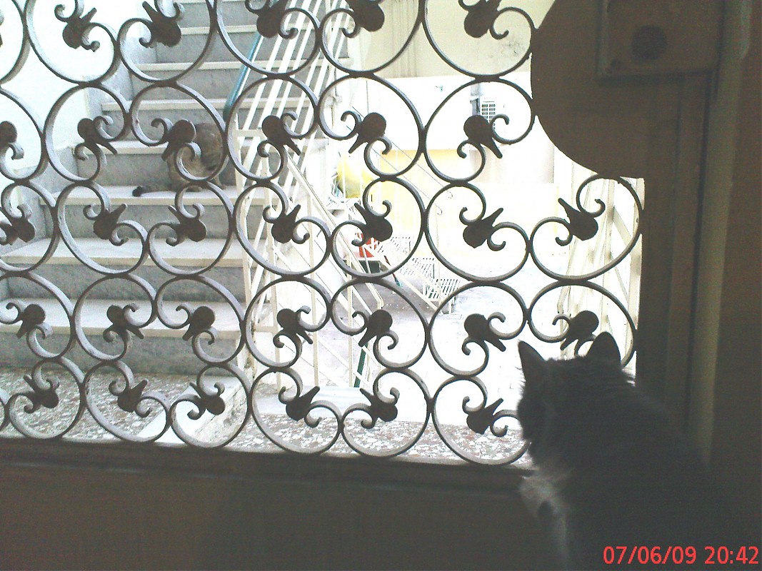 Εξω ακριβως απο την εξωπορτα του σπιτιου μας,υπαρχει παντα ενα μπολακι με φαγητο και νερο για οσα αδεσποτα καταφερουν να φτασουν εδω(ειναι λιγα,γιατι βλεπει στον ακαλυπτο,και πρεπει να το ξερουν για να ερθουν)Αυτη τη στιγμη,ειναι τρια...ο Τσαρλυ,η Τρωει και η Μαμακα!! Τωρα τελευταια ερχεται μονο η Τρωει,η οποια δυστυχως ειναι και εγκυος Τις προαλλες ειχαμε συναντηση κορυφης με τη Leia,η οποια κατεληξε(παραδοξως)με μυτουλες για να μυριστουν και χωρις "χου" Δειτε ομως,υπο ποιες συνθηκες...και τι εκανε η τζενται μετα.... Η Leia μεσα και η Τρωει απέξω... (Η εικόνα βρίσκεται στο τέλος του κειμένου) Και μετα αποφασισε οτι θελει να δει καλυτερα....και σκαρφαλωσε μεχρι πανω... (Η εικόνα βρίσκεται στο τέλος του κειμένου) Σημείωση: Το μήνυμα αυτό γράφτηκε 16 χρόνια πριν. Ο συντάκτης του πιθανόν να έχει αλλάξει απόψεις έκτοτε.