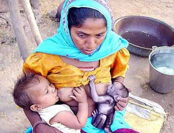 Δείχνει μία μητέρα, η οποία από το ένα της στήθος θηλάζει το μικρό της παιδί και από το άλλο, ένα νεογέννητο πιθηκάκι.