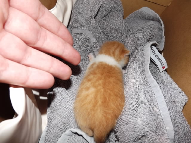 Καλό θα είναι να του βάλεις μια θερμοφόρα, ας είναι καλοκαίρι, τα μωρά γατάκια δεν έχουν ακόμα την δυνατότητα να διατηρήσουν μια σταθερή θερμοκρασία, δεν έχουν δηλαδή την δυνατότητα για ομοιόσταση. Αν τυχόν δεν έχεις θερμοφόρα, χρησιμοποίησε μπουκαλάκια από νερό που θα τα γεμίσεις με ζεστό νεράκι και θα τα τυλίξεις με μια πετσετούλα για να μην καεί κιόλας.