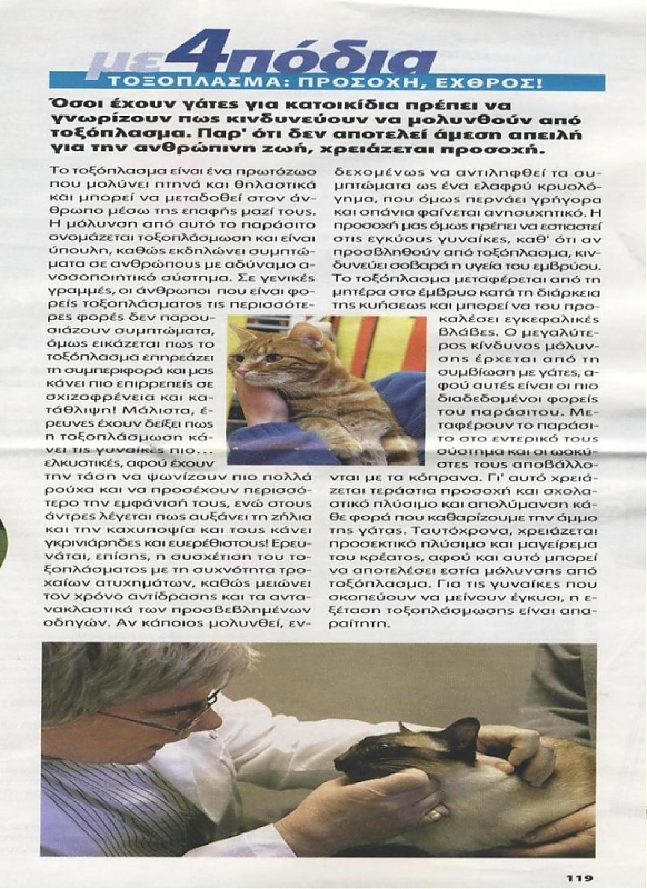 'Οσοι έχουν γάτες για κατοικίδια πρέπει να γνωρίζουν πως κινδυνεύουν να μολυνθούν απο τοξόπλασμα. Παρ' ότι δεν αποτελεί άμεση απειλή για την ανθρώπινη ζωή, χρειάζεται προσοχή.