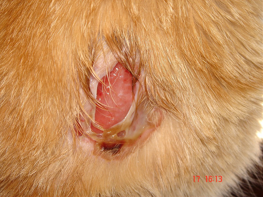 Παρασκευη πρωι σηκωνομαι και βλεπω να εχει μια πληγη τεραστια,να του τρεχει αιμα και πυον απο εκεινο το ''σακουλακι'' το κουφιο υποτιθετε και να ειναι φαγωμενος ο ζωικος ιστος του δηλαδη ενα σημειο που φαινονταν το δερμα και ο ιστος του δερματος..Πηγαμε στον κτηνιατρο αμμεσα και του χορηγηθηκαν φαρμακα αμμεσα φυσικα...Εχω και φωτογραφια να παραθεσω αν χρειαστει αλλα ειναι λιγο τραγικη η εικονα