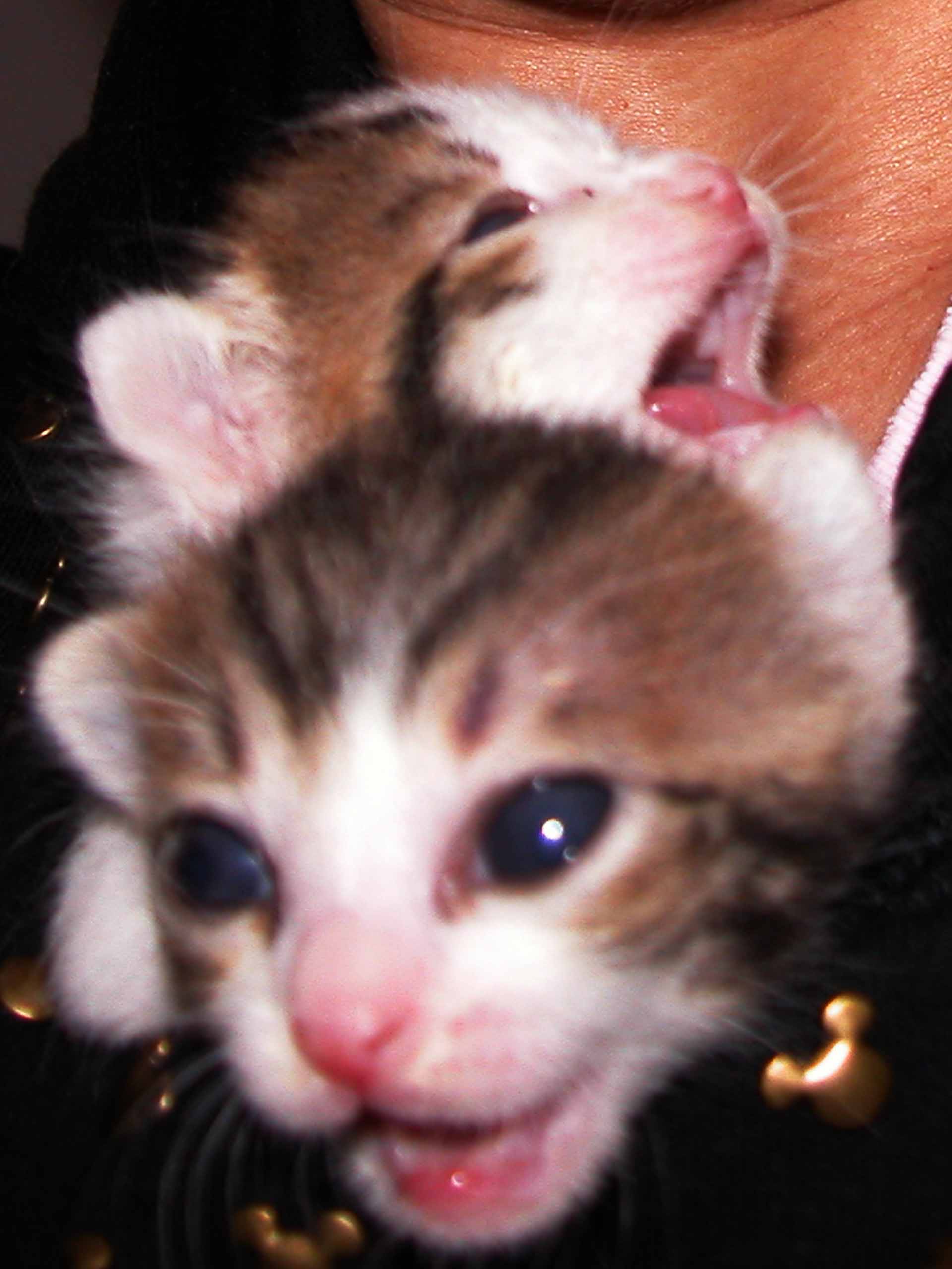 Τα γατάκια πρέπει να είναι περίπου 2 εβδομάδων, ίσως λίγο μικρότερα. Την πρώτη φορά που τα τάισα πρέπει να είχαν μείνει νηστικά αρκετή ώρα, ίσως γύρω στις 13-14 ώρες, φαίνονταν όμως να ναι σε καλή κατάσταση. Καμμιά ιδέα;