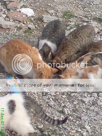 φετος το καλοκαιρι δε βρηκα σκυλια,αλλα απειρα γατια.γατες με γατακια,μωρα ετοιμοθανατα,αρρωστα,ολα σε αθλια κατασταση.ζουσαν μεσα στους σκουπιδοντενεκεδες περιμενοντας να περασει καποιος να πεταξει σκουπιδια για να βρουν τιποτα να φανε.ηταν πολυ αγριες και δε σε πλησιαζαν με τιποτα.οργανωθηκα,πηρα 30 κιλα ξηρη τροφη και αρχισα να πηγαινω καθε μερα να τις ταιζω(μη σας πω τι ακουγα απο κατοικους που περναγαν απο'κει "και τι τις ταιζεις να πολλαπλασιαζονται και να λερωνουν τον τοπο σκιζοντας τις σακουλες με τα σκουπιδια","δεν πειραζει,μολις ερθει ο χειμωνας να δεις που θα πανε κι αυτες",και αλλα τετοια χαριτωμενα.