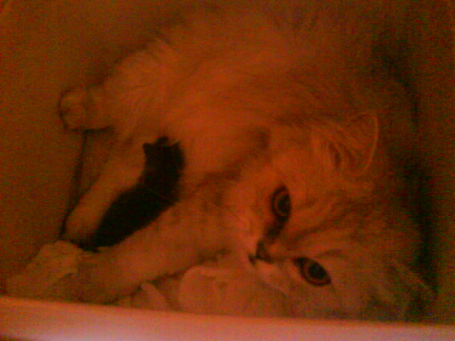 A ok.Τα είπα λίγο μπερδεμένα μάλλον! Η μουρίτσα ζούσε στο εκτροφείο της Sabi (Βλ. chinchilla maniacs!). Αυτο σημαίνει ότι είχε κάνει αρκετές γέννες εκεί. Επειδή όμως είχε στενή λεκάνη, μετά την τελευταία της γέννα - πριν 6 μήνες νομίζω περίπου- την στείρωσε και την πήρα εγώ. Εγώ την πήρα αμέσως μόλις μεγάλωσαν τα μωρά της. Είναι εντυπωσιακό γιατί ενώ έχει υποφέρει στις γέννες της, αγαπάει τόσο τα μωρά γατάκια...