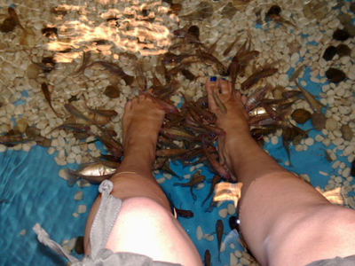 νεα μοδα το λενε οι συχαμενη.γεινετε με ενα ιδους ψαριου που λεγετε 'garra rufa(κυπρινοι)οι πελατες βαζου το ποδια τους σε γιαλες γενατα ζοηδανα μιρκα ψαρακια,και τα ψαρια αυτα αφερουν νεκρα κυτταρα.δεν εχουν δοντια για αυτο δεν δαγονουν ενδονα(μακαρη!)και δεν κανουν ζημια στο ποδια.και καστιζει αυτο απο 35ευρο το 15'.τα ξεκινεισαν στην Τουρκια,και τωρα εχει φτασι στην Ελλαδα.προσπαθω να βρω περεσοτερες λεπτομεριες,διλαδι μαλον τους κρατανε νιστικα μονιμος για να κανουν την δουλια ανα πασα στηγμη.τι κανουν οταν αυτα μεγαλονουν,αν δεν ψοφανε στην διαρκια του πεντικιουρ.οπιος εχει ενεδριο ξερει πωσο δισκολα να τα κρατας τα ψαρια,και πωσο ευκολα τα χανεις.οσο ειπαρχουν ανθροποι που ζητανε διαφορα τετια τοσο να εποφερουν τα ζωα.:/: