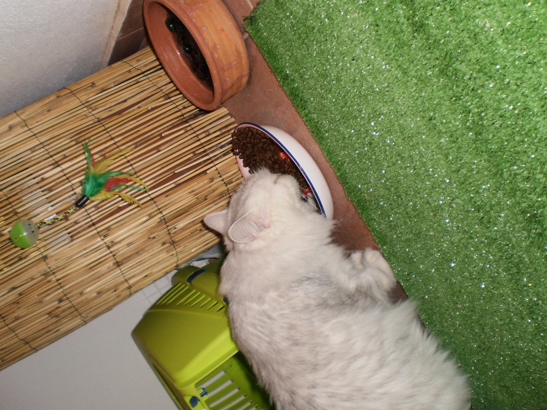 Το βράδυ νιαουρίσαμε αρκετές φορές, σαν γνήσιοι εκπρόσωποι του γυναικείου φύλου:), με το πιο χαριτωμένο νιαούρισμα που έχω ακούσει! Βέβαια κάποιοι ξυπνήσαμε αρκετές φορές απο αυτόν τον κατά τα άλλα πανέμορφο ήχο με αποτέλεσμα το πρωί να κουτουλάμε λιγάκι στη δουλειά:lol:! Το μεσημέρι φάγαμε παρέα με τη νέα μας μαμά αργά και σταθερά γιατί κάναμε διαλλείματα για να τριφτούμε. Είμαστε λίγο φοβισμένες όπως είναι φυσικό γι αυτό και ο τρόπος που τριβόμαστε είναι λίγο διστακτικός αλλά για 2 μέρα το θεωρώ τουλάχιστον θαυμα που με αφήνει να την ακουμπάω!