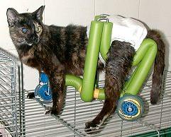 Σε σκύλους υπάρχουν ειδικά καροτσάκια για παραπληγικά ζώα, με τα οποία στηρίζεται το πίσω μέρος του σώματος και σέρνουν τα πόδια τους πάνω σε ροδάκια. Υπάρχουν αρκετές τέτοιες κατασκευές. Κυκλοφορούν και στην Ελλάδα. Για γάτες όμως, δεν δούλεψε τέτοιο σύστημα. Εκτός αυτού, ακόμα και στους σκύλους, κάποια στιγμή, έρχεται η ώρα της ευθανασίας.