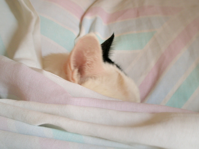 Εδώ είναι η Άσπρη μου, ξαπλωμένη κανονικά στο κρεβάτι με το κεφάλι στο μαξιλάρι και σκεπασμένη με το σεντόνι, 1-2 μέρες έπειτα από την εγχείρηση που έκανε στις 28 Αυγούστου... :inlove::inlove::inlove: