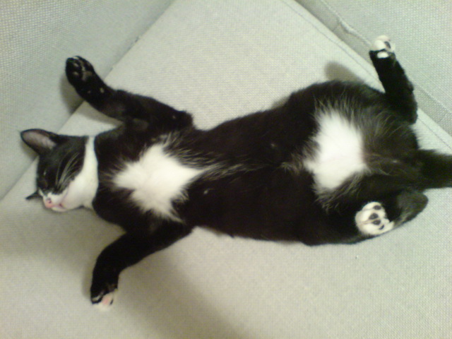 Όταν βαρεθεί, ανεβαίνει στο κρεβάτι μου και κοιμάται στο πλάι..ακριβώς πίσω από την πλάτη μου. Το καλύτερο σημείο του κρεβατιού παιρνει ο άτιμος..αυτό που είναι μπροστα από το καλοριφέρ!! Ανα τακτα χρονικά διαστήματα μου κάνει και πατουσάκια..αν τον ενοχλώ μάλλον! ;)