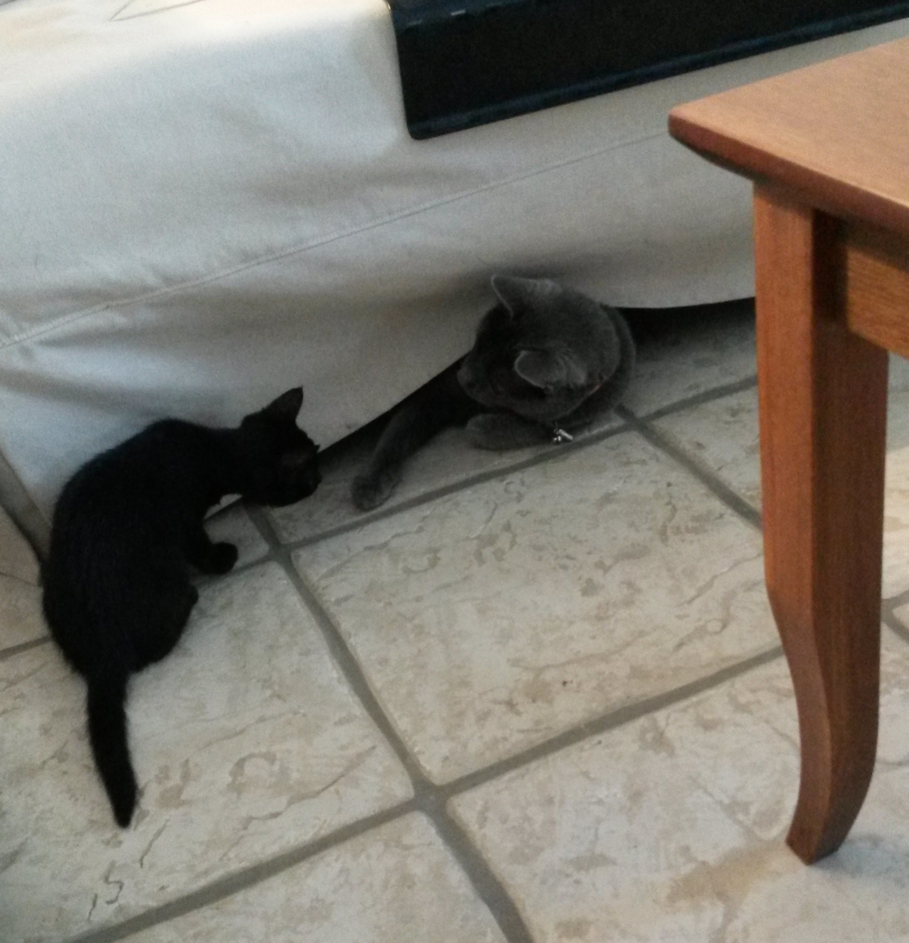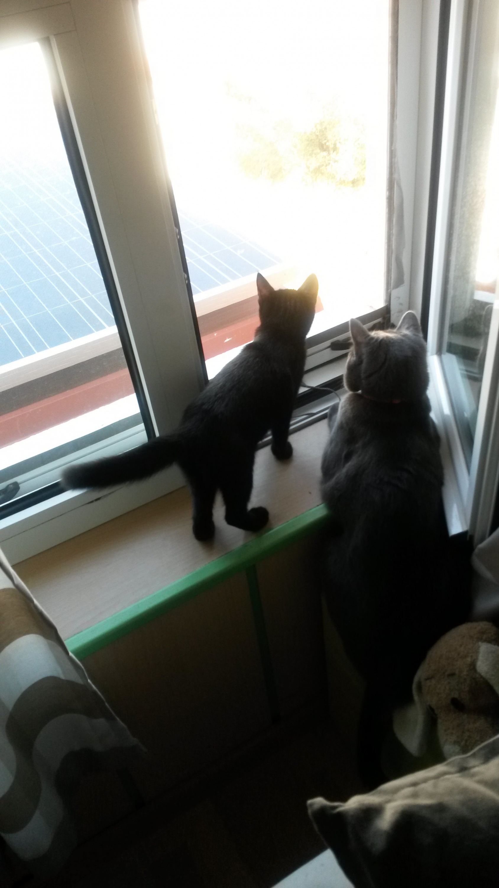 Καθονται με τις ωρες στο παραθυρο μαζι και κατασκοπευουν τα σπουργιτακια που περνουν απ εξω! Πινουν νερο απο το ιδιο μπωλ και παει το ενα στην αμμο του αλλου! Κατι που ηταν αιτια τσακωμου τις πρωτες μερες... Κοιμουνται σχετικα κοντα. Οχι αγκαλια αλλα σε μια κοντινη αποσταση. Οι καυγαδες υπαρχουν ακομα αλλα ειναι λιγοτεροι. Καμια φορα εχω προσεξει οτι εκει που την κυνηγαει επειδη τον εχει τσαντισει την πιανει και της ριχνει μια ντροπαλη κλεφτη γλειψια με την γλωσσιτσα του και φευγει! Δεν τα αφηνω ακομα καθολου μονα τους οταν φευγω απο το σπιτι αλλα καποια στιγμη θα γινει κι αυτο!! Η μικρη εχει ηρεμησει καπως.. εχει σταματησει να τον ενοχλει συνεχεια.. βρισκει ασχολια στα απειρα παιχνιδια που της εχω παρει! Βεβαια οσα και να της παρω δεν υπαρχει τιποτα καλυτερο γι αυτην απο το να βρει μια τσαλακωμενη αποδειξη πανω στο τραπεζι! Θησαυρος! Αυτα λοιπον... Ελπιζω σε κατι ακομα καλυτερο! Ευχαριστω πολυ γιατι μου δωσατε πολυ κουραγιο!!!