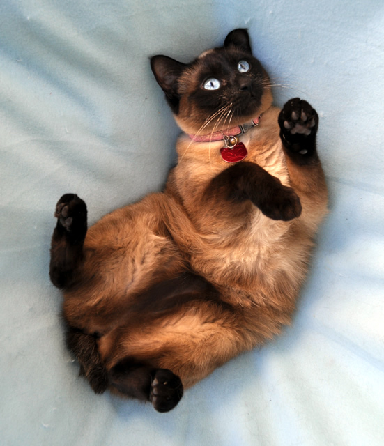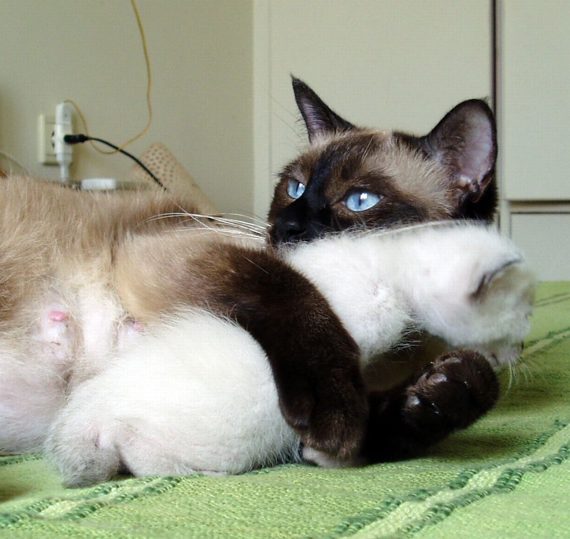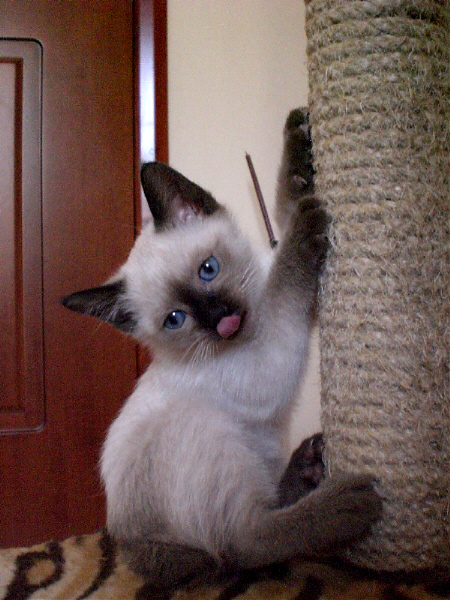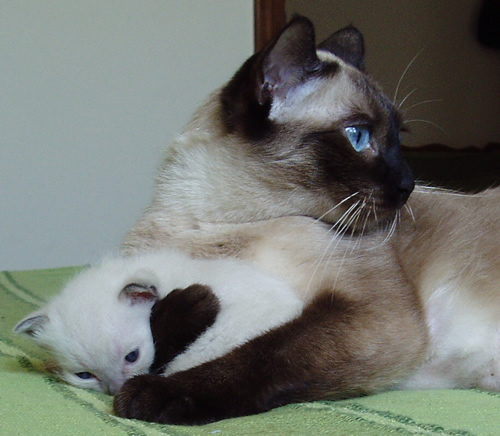 Δεν είχαμε σκοπό να πάρουμε δεύτερο γατάκι,αλλά όταν είδα τη Μόιρα μαζί με τα αδερφάκια της δε μπορούσα να πάρω τα μάτια μου από πάνω της.Γεννήθηκε στην Κρήτη,πρώτη προς δεύτερη Απριλίου του 2008. Η Άννα,η κοπέλα που μας τη χάρισε,την κράτησε μέχρι πέντε μηνων σχεδόν για να μπορέσουμε να μετακομίσουμε πρώτα και μετά να την πάρουμε στο σπίτι,ώστε να μην αναστατωθεί με όλες τις μετακινήσεις.Εκτός από τα πανέμορφα γαλανά της μάτια,χαρακτηριστική είναι και η κοντή και γυριστή σοκολατένια ουρίτσα της. Είναι παραδοσιακή σιάμ, που πλέον ονομάζονται Thai και είχαμε τη χαρά να δούμε μία φορά μωράκια δικά της και του Σίμπα,του σιαμέζου της αγαπημένης μου φίλης Βασιλικής,πριν στειρωθούν και οι δύο.