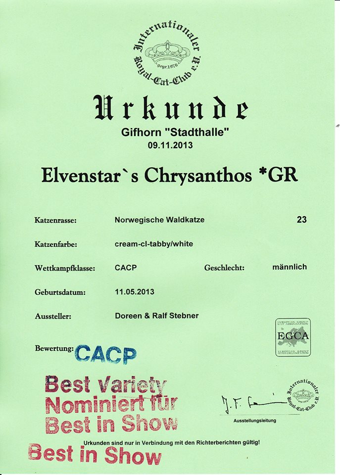 Ex 1, No. 4 από 33 γάτες στον τελικό όλων των φυλών, Best in Variety,υποψηφιότητα για Best in Show και Best in Show στην κατηγορία ημιμακρύτριχων!Ένα μεγάλο ευχαριστώ στη Doreen και τον Ralf που τον παρουσίασαν άψογα! :D