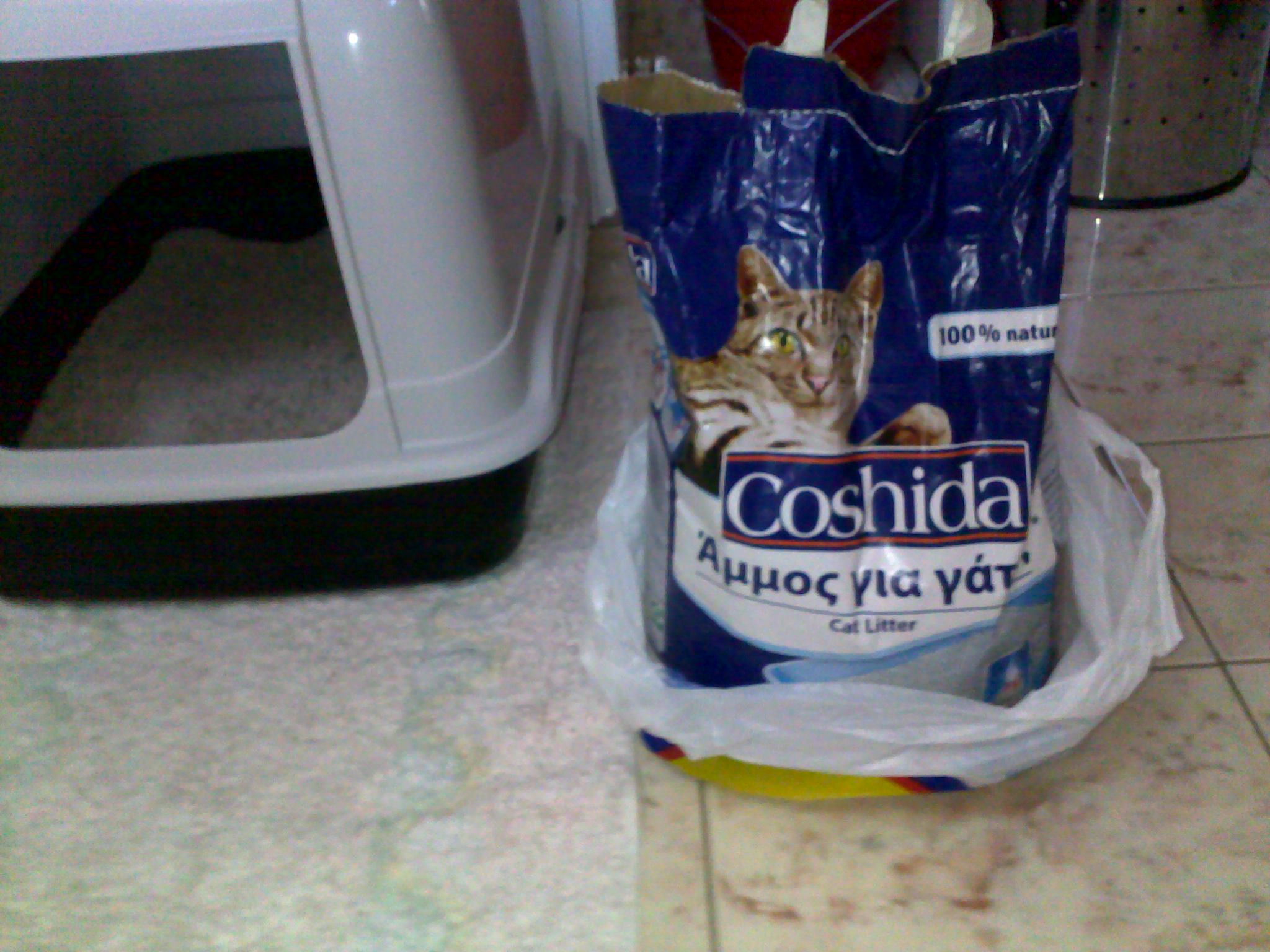 Μετά πήγα στην Biokat's λευκή, πιο χοντρόκκοκη και αόσμη, αλλά παρατήρησα οτι σήκωνε πολύ περισσότερη σκόνη από εκείνη με την πράσινη συσκευασία, καθώς σκάβοντας την ανάδευε