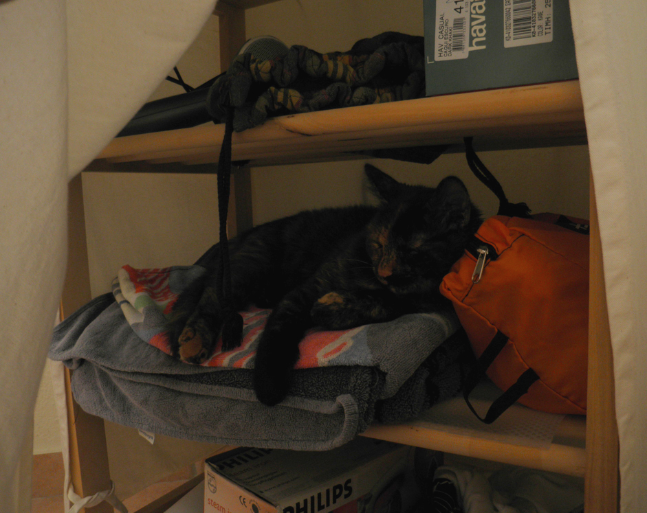 (ειναι το επιπλο-συρταριερα της κρεβατοκαμαρας, το οποιο μπροστα κλεινει με πανι...θελει και την ησυχια του το γατι, καταλαβαινετε...)