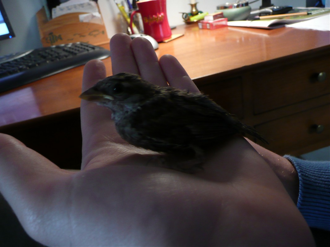 η γάτα μου έφερε στο σπίτι ένα μωρό πουλάκι, μάλλον σπουργίτι που δεν δείχνει χτυπημένο. Μονο τρομαγμένο.