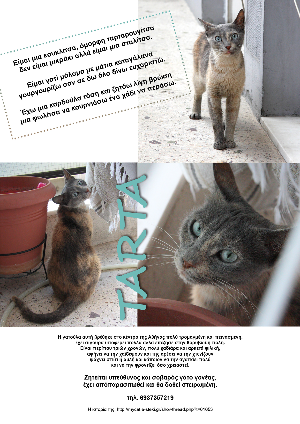 Μερικοί ίσως θυμάστε μια λίγο παλιότερη αγγελία της, η τάρτα είναι μια 3χρονη γατούλα που βρέθηκε στο κέντρο της Αθήνας σχεδόν σκελετωμένη, αφυδατωμένη και πολύ αδύναμη σε πολύ αρχικό στάδιο εγκυμοσύνης.