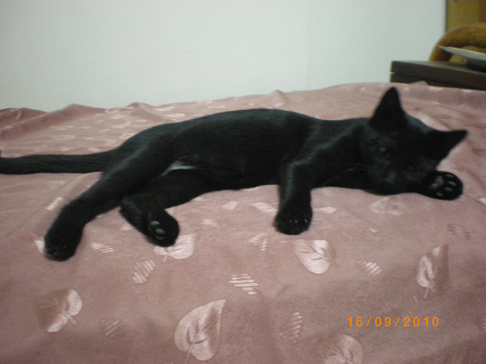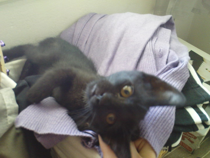 Ειναι θηλυκο, τριων μηνων, αποπαρασιτωμενο με γυαλιστερο καταμαυρο τριχωμα. Οι μόνες άσπρες πινελιές πάνω της είναι στις μασχάλες της και μια άσπρη βούλα στην κοιλίτσα της. Το μπροστινο ποδαρακι του το παταει λιγο στραβα λογω παλιου χτυπηματος αλλα χωρις να της δημιουργει κανενα προβλημα. Δινεται με συμβολαιο υιοθεσιας.