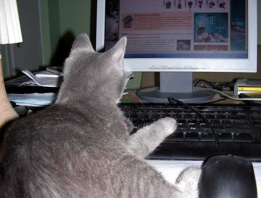 ), παίζω με την κορδέλα και το μπαλάκι μου και ανεβοκατεβαίνω με αστραπιαίες ταχύτητες στο γατόδεντρο. Μεθαύριο μου είπαν ότι θα πάω και για το πρώτο μου εμβόλιο. Ακούς, τυχερέ μελλοντικέ μου γατογονιέ; Κομπλέ και σενιαρισμένο θα με πάρεις!! Επειδή είμαι όλη μέρα μέσα στο γραφείο και, για να σας πω την αλήθεια, βαριέμαι λίγο μόνος μου, περνάω την ώρα μου στο ιντερνετ:
