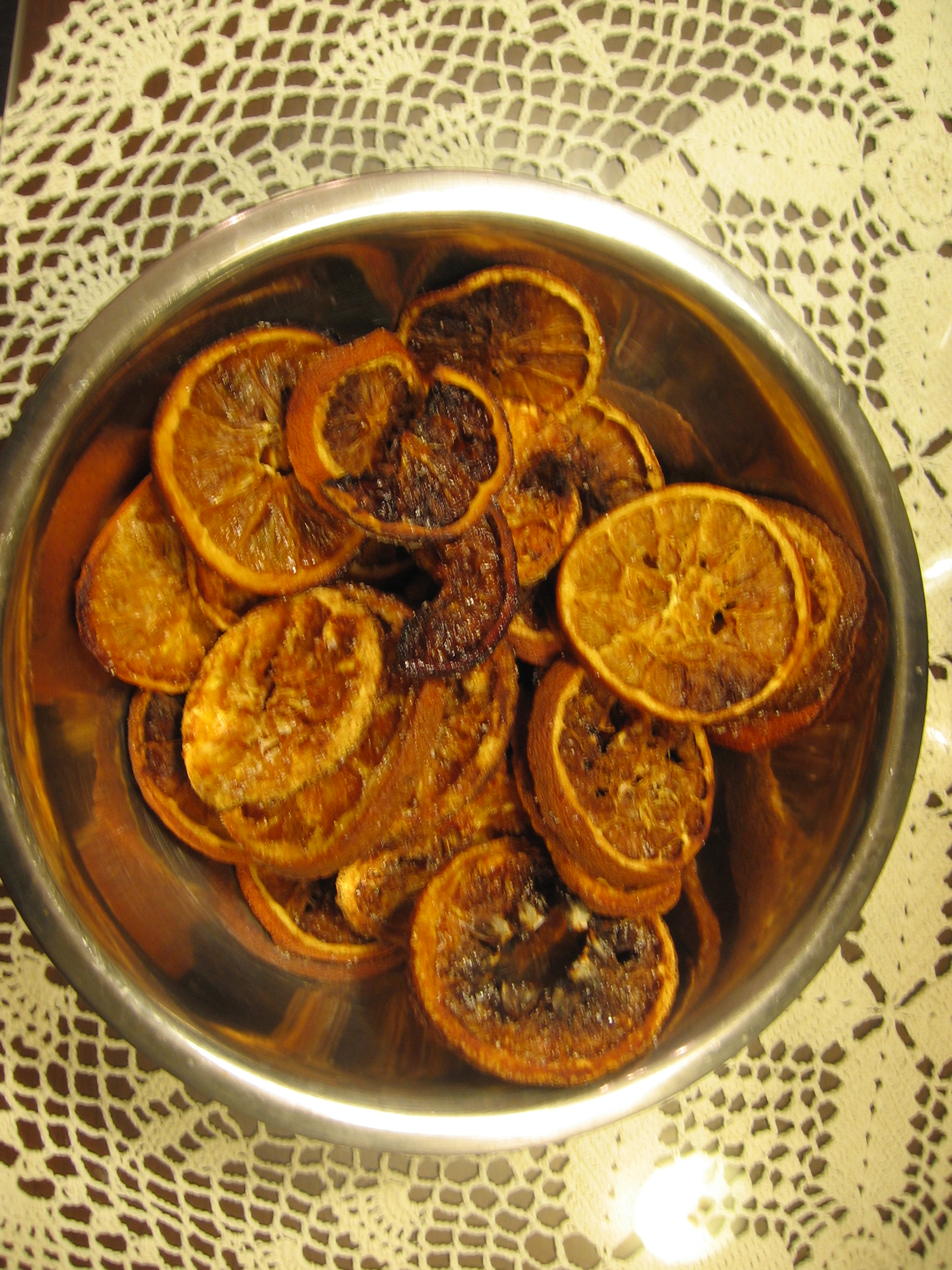 Κόβουμε τα πορτοκάλια σε φλούδες. Πιέζουμε την σάρκα τους με τα δάκτυλα ούτως ώστε να αποβάλουν αρκετό από τον χυμό τους. Ραντίζουμε με ζάχαρη. Προθερμαίνουμε τον φούρνο στους 150 βαθμούς. Βάζουμε τις φλούδες πορτοκαλιού σε ταψί με αντικολλητική κόλλα, αραιά τη μία από την άλλη. Στο φούρνο τις αφήνουμε για 2 μόνον ώρες, γυρίζοντας κάθε 30 λεπτά ούτως ώστε να ψηθούν και οι δύο τους πλευρές το ίδιο. Σβήνουμε τον φούρνο και χωρίς να τον ανοίξουμε, αφήνουμε τα πορτοκάλια μέσα για 8 ώρες. Θα αποξηρανθούν θαυμάσια διατηρώντας το όμορφο τους χρώμα. Ακόμα όμως και αν κάποια μαυρίσουν σε κάποια σημεία, μην βιαστείτε να τα πετάξετε. Θα ανακαλύψετε ότι συνδυάζονται πολύ γλυκά με τα υπόλοιπα υλικά σας. Βερνικώνουμε.