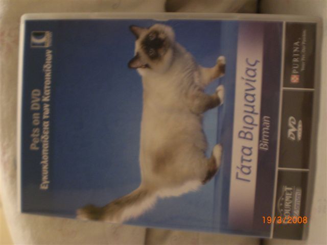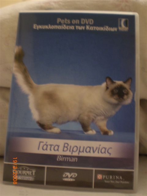 DVD της σειράς Pets on DVD - εγκυκλοπαίδεια των κατοικίδιων - με σπόνσορα την Purina - όπου διατίθεται για πολλές ράτσες γατιών και σκυλιών... και φυσικά και στα δικά μας ζουζούνια... Την πήρα και την απόλαυσα. Κάτσαμε και την είδαμε οικογενειακώς (τα παιδιά χάζευαν τα Βιρμανάκια)...! Πολύ ενδιαφέρουσα, μεταγλωτισμένη αλλά συγχρόνως και με υπότιτλους, με ωραίες πληροφορίες και εκπληκτικά Βιρμανάκια... ! Είμαι σίγουρη ότι θα αναγνωρίσετε και το δικό σας εκεί αφού μοιάζουν καταπληκτικά!! Για όσους δεν έχουν κι ονειρεύονται μία, θα ξετρελαθούν ακόμα περισσότερο! Κοστίζει 6.90 ευρώ και ίσως να υπάρχει και σε άλλα pet shops... αυτό δεν το γνωρίζω... Μπορώ να βοηθήσω όμως όσους δεν έχουν pet city κοντά τους παραγγέλνοντάς την από το δικό μου...
