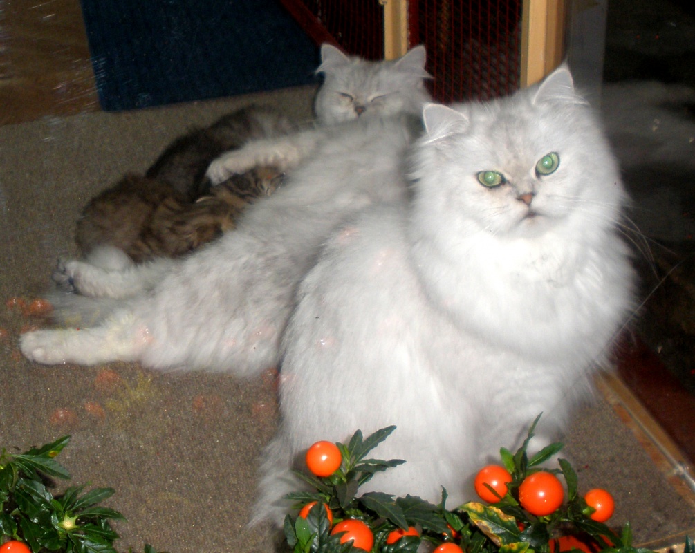 Ο Κρις ειναι πατερας της Ισις,και η μητερα της ειναι η Κισα.Η Κισα ειναι πιο τριφερη και κοινονηκι γατα μου,την καναμε κεσαρικη αλλα δεν την στειροσα,γιατι ειναι προτη κεσαρικη της και ο γιατρος ειπε οτι θα γεννεισει μια χαρα σε ενα χρωνο.Οριστε το πορτρετο της.Η γατα σε βαθος που θυλαζει τα μωρα ειναι η Μουρα,αυτη την στειροσα και ιδι εχω βρει μια εκογενια που θα την παρουνπεραστικά σου εύχομαι ελπίζω να πάνε όλα καλά! και αυτός είναι πολύ όμορφος να τον βάλεις και στο site του εκτροφείου σου και τα μικρά επίσης! οι γάτες που έκαναν τις γέννες τελευταία τις στείρωσες και τις δύο έτσι?? και έχω και μια απορία η μαμά της δικιάς μου ποία είναι?? γιατί με την αδερφή μου βλέπουμε τις φωτογραφίες και προσπαθούμε να την βρούμε , έχουμε καταλήξει οτι είναι η Μασιάνια αλλά το συμπέρασμα μας είναι οτι μοιάζει πάρα πολύ στον Κρίς στη φατσούλα της θα βάλω και φώτο αργότερα να την δεις !!