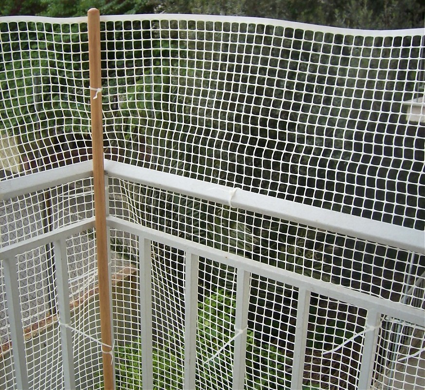 Το πλέγμα εξέχει λίγο από την κουπαστή, αλλά το θέμα είναι πως έχω παντού γλάστρες και μπορεί εύκολα να ανέβει στη γλάστρα και από εκεί, αν θελήσει, να σκαρφαλώσει στο πλέγμα και να πηδήξει.