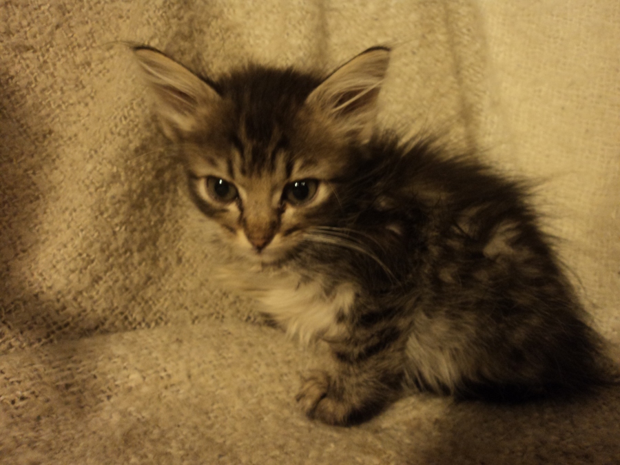 Ειναι 2,5 μηνών φουντωτό κοριτσάκι , αρνητικο για aids-λευκαιμία-τοξόπλασμα, δίδεται με προυπόθεση στείρωσης και συμβόλαιο υιοθεσίας, χρωματισμός black silver tabby.