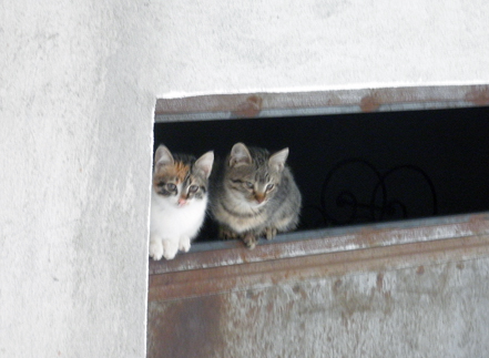 Η φωτοτυπια λοιπον πρεπει να ειναι καπου 1μιση μηνων και ηταν ως τωρα πολυ καλα κρυμενη! Αποφασισα να την κατεβασω τροφη και νερο στον ακαλυπτο που συγγενευει με την πυλωτη μας. Το πρωτο πραγμα που με εντυπωσιασε ειναι ποσο φιλικη ειναι, πρωτα για χαδακια ηρθε και μετα για φαγητο. Επειδη παρατηρησα επισης οτι ειχε αρκετες ακαθαρσιες, ξανακατεβηκα για να καθαρισω, οσο ημουν κατω τα κλαματα αρχισαν να πολλαπλασιαζονται και ξαφνου τι να δω, τρια μουτρακια να με κοιτανε απο ενα κενο/παραθυρο μια αποθηκης στην οικοδομη:eek: